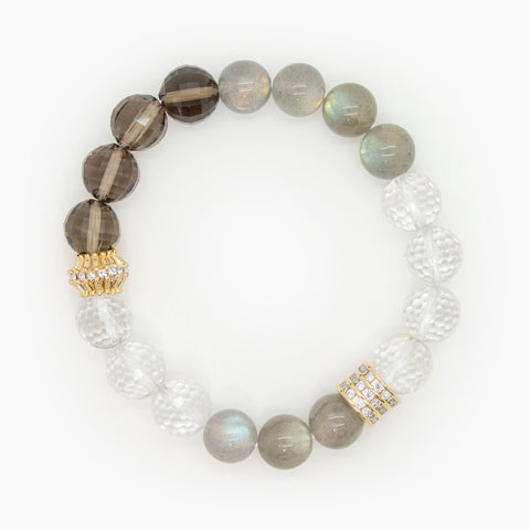 水晶で浄化をして、ラブラドライトで天からの導きを受け、ゴールドパーツのような輝かしい成功や幸福を、スモーキークォーツで邪気を祓いながら自分の居場所としてしっかりとグランディング(固定)する。