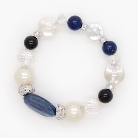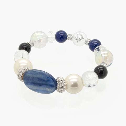 これらの石の並びは、カイアナイトが1つ、刻印入り水晶が1つ、パールが2つ、ブルータイガーアイが2つ、ラピスラズリも2つという、数字で言うと1と2というバランスになっております。意味合い的には1がスタート、2がご縁。全て物事は、スタート(始まり)とご縁です。人との繋がりはご縁から始まりますので、とても縁起の良いデザインではないかと思っております。